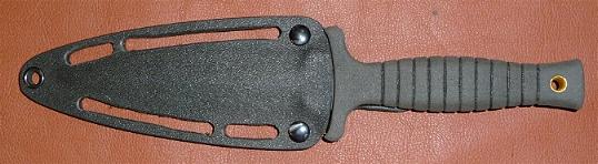 im Prototypenstadium sehen. Die Endausführung wird statt der zwei Nieten zwei Ösen enthalten. Das Messer wird durch den starken Kydex-Haken auf der Rückseite extrem fest
